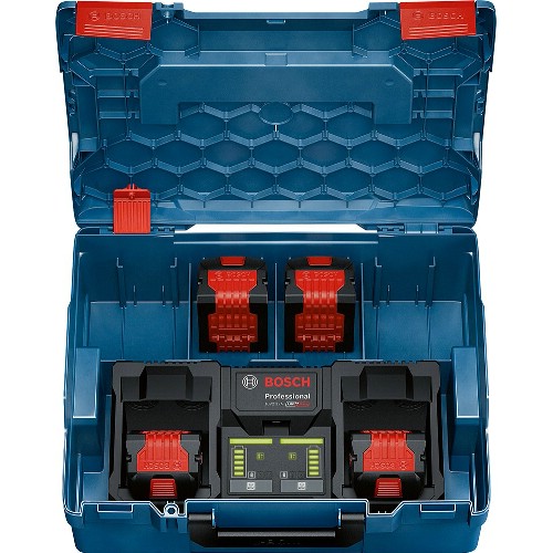 Snabbladdare med dubbla laddportar, för Bosch Li-Ion batterier 18 V. Tre olika laddningslägen, Standard, PowerBoost och Long Life. Laddningsspänning på 16 A per laddport gör den mycket snabb och laddar två Expert 18 V 8,0 Ah-batteri till 100% på 39 minuter. Active Air Cooling 3.0-funktion, kyler ner batterierna och håller de svala under laddning. FlexTemp Charging utökar laddningstemperaturområdet för Expert-batterier. Laddindikator i 5 nivåer visar den exakta statusen för batterierna. Levereras i en specialkonstruerad L-BOXX med plats för fyra batterier och laddare.