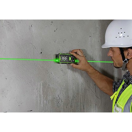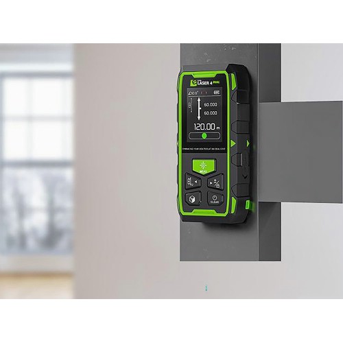 En helt unik avståndsmätare som mäter i båda riktningarna eller upp och ner. Det är slut på att behöva gå på knä för att mäta takhöjd, eller gå ut till väggen för att hitta bredden. Med Elma Laser 4 Dual mäter du helt enkelt mitt i rummet, och med dubbel laser mäts både avståndet till tak och golv, och den totala rumshöjden visas. Eller stick handen genom loftluckan och mät hela längden på vindsvåningen med ett tryck. Det sparar tid och säkerställer korrekt mätning. Lasern är också utrustad med en digital färgdisplay som roterar beroende på hur instrumentet hålls, vilket gör avläsningen enkel. Förutom digital visning av lutning har en digital version av vattenpassets bubbla lagts till, som med tydlig grön färg indikerar när instrumentet hålls horisontellt. Vidare är instrumentet utrustat med många standardfunktioner från professionella avståndsmätare, t.ex. Tracking för kontinuerlig mätning, Pythagoras-funktion för indirekt mätning av exempelvis fasadhöjder, m.m. Det har även +/- funktion samt en räknare för att beräkna ytor och volym.