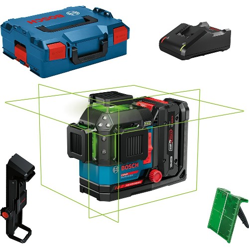 Cirkellaser med gröna laserlinjer för ökad synlighet. Ingår i Bosch Expert 18 V sortiment. Projicerar 3x360° klara och tydliga laserlinjer. Arbetsintervall på upp till 35 m utan mottagare och upp till 120 m med mottagare (ingår ej). Tålig design med gummibelagt hölje, damm- och stänkvattenskydd i klass IP65 för att klara tuffa miljöer. Med finjustering för den vertikala linjen utan att förlora referenspunkten. Självnivelleringsintervall på upp till +/- 4° på 3 sekunder. Triple Power-funktion, drivs av 18 V eller 12 V Li-Ion batterier eller 4 st 1,5 V LR14-batterier (C). Upp till 24 h driftstid i 3-linjeläge, med 18 V 4,0 Ah batteri. Utrustad med en Bluetooth-modul som tillåter trådlös fjärrstyrning via en smarttelefon tillsammans med appen Bosch Levelling Remote App. Batteriindikator. Integrerat universalfäste som är försett med starka magneter. 1/4" och 5/8" stativgänga. Kan användas tillsammans med lasermottagare LR 7. Kompatibel med batterier och laddare i Bosch Expert 18 V sortiment, Bosch Professional 12 V/18 V System och AMPShare Alliance.