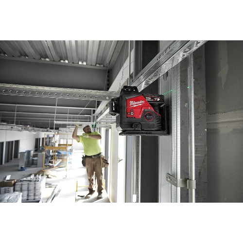 Set med robust och tålig cirkellaser med extra hög synlighet tack vare gröna laserlinjer. Projicerar en horisontell och två vertikala 360° klara och tydliga laserlinjer, för smidig invägning, utmarkering av räta vinklar och överföringar. Räckvidd på upp till 38 m utan mottagare och upp till 100 m med mottagare (ingår ej). Självnivellerande upp till 4° avvikelse med varning när lasern är utanför toleranserna. Manuellt läge för användning med vinkling. Integrerat magnetfäste med 1/4" och 5/8" stativgänga samt spikhål som möjliggör upphängning på plåtreglar, träreglar. Fästet ger också 360° rotation med finjustering. Robust konstruktion med IP54-klassning som skyddar mot damm och fukt samt klarar fall på upp till 1 m. Drivs av M12 Li-Ion batteri som ger en driftstid för en hel arbetsdag med ett M12 4,0 Ah-batteri. Kompatibel med lasermottagare LLD50 och LRD100. Flexibelt batterisystem, passar samtliga Milwaukee M12-batterier.
