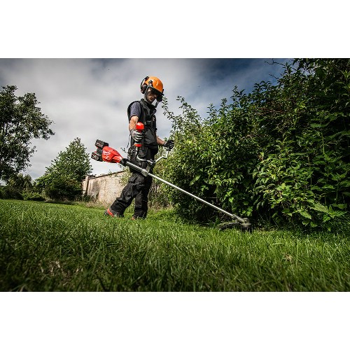 Standardutrustning: 2 st 18 V 12,0 Ah Li-Ion batteri, dubbelladdare, dubbel axelsele, tretandad röjsågsklinga, trimmerhuvud och dubbla kling-/trådskydd.