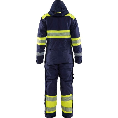 Vind- og vanntett vinterkjeledress med høy synlighet, teipede sømmer og vattert fôr. Brystlommer med vannavvisende glidelåser. D-ring i den ene brystlommen. Pennelomme på ermet. Sidelommer med glidelås. Baklomme med glidelås. Innvendig nettinglomme med glidelås. Benlomme med klaff og telefonlomme. Tommestokklomme med knivholder og pennelomme. Avtakbar ID-kortlomme. Verktøylommer i Cordura selges separat. Sløyfer på begge sider av brystet for plassering av mikrofon og annet tilbehør. Karabinkrok i metall. Avtakbar og justerbar hette tilpasset hjelm og øreklokker. Fleecefôret høy krage med glidelås. Frontlukking med skjult, kraftig toveis glidelås i plast og dobbel frontklaff med borrelås. Meshpanel ved ermhull og skulderblad. Toveis glidelås langs hele sidesømmen. Elastikk i midjen. Innvendige lommer for kneputer. Snølås, kan åpnes med borrelås og knapp. 50 mm brede cut transfer-reflekser på overkropp, ermer og ben. Refleks på skuldrene. Refleks på baksiden av hetten. Vannsøyle 15000 mm, pusteevne Ret 8,5. Vask 40°C.
